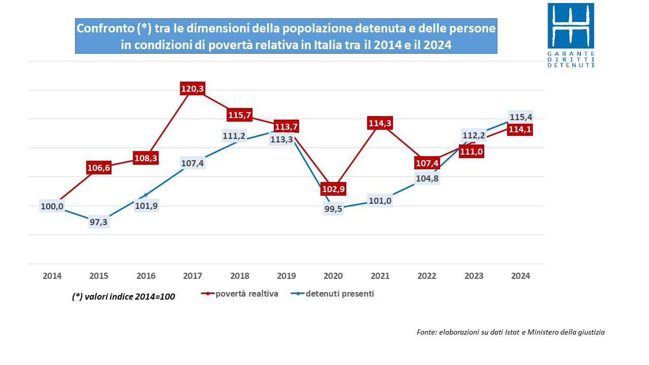 Il confronto tra i dati riferiti al decennio 2014–2024 (espressi in valori indice e con il 2014 come anno base) evidenzia un notevole parallelismo tra l’andamento della popolazione detenuta e quello dei numeri rilevati dall’Istat delle persone in condizioni di povertà relativa (e cioè di coloro che presentano un forte disagio economico rispetto alla maggioranza della popolazione)