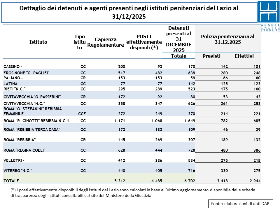 Nel Lazio il tasso medio di affollamento dei 14 istituti penitenziari ha raggiunto il 146% e sono otto le strutture in cui tale indice supera la soglia del 150%.
