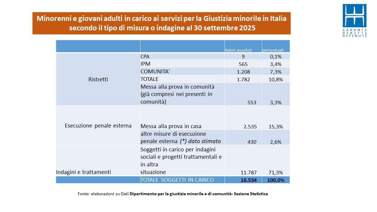 Secondo le ultime rilevazioni diffuse dal Dipartimento per la giustizia minorile e di comunità del ministero della Giustizia, in tutta Italia alla data del 30 settembre risultavano 16.534 minorenni o giovani adulti complessivamente in carico agli uffici territoriali. Rispetto all’inizio dell’anno si è verificato un incremento di 1.566 unità, corrispondente a un tasso del 10,5%.