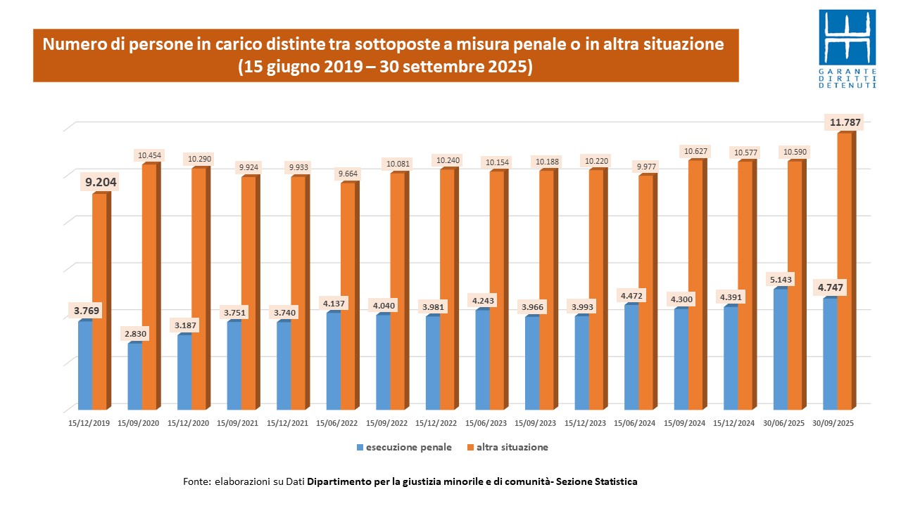 In particolare considerando solo le persone sottoposte a misure penali restrittive della libertà si è passati dalle 4.391 di fine 2024 alle attuali 4.747 (+8,1%).