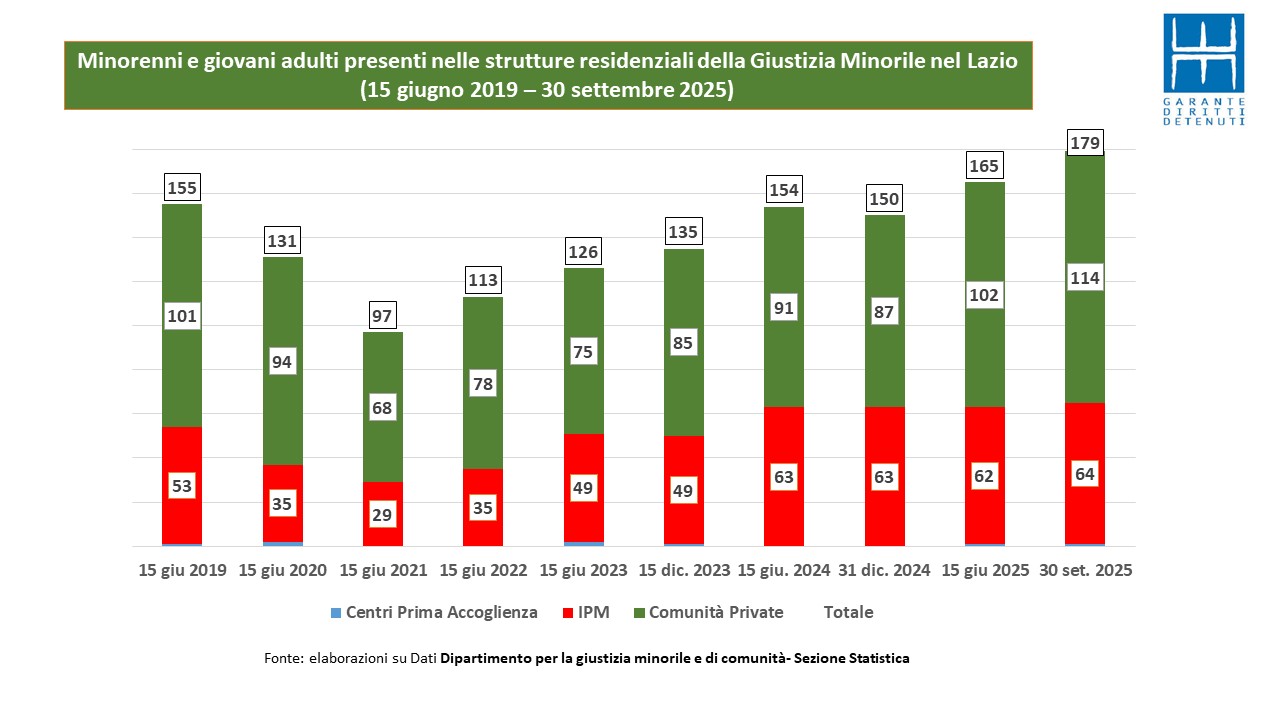 In questo contesto la situazione del Lazio risulta in gran parte simile a quella nazionale: da giugno 2023 alla fine di settembre di quest’anno il numero dei minori e giovani adulti ristretti a Casal del Marmo o in comunità è cresciuto del 39% passando da 126 a 179.