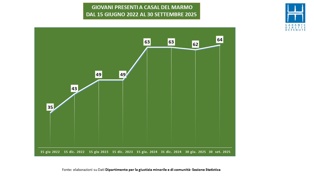 In particolare va sottolineato che a Casal del Marmo il numero dei presenti da giugno dello scorso anno supera stabilmente la soglia della capienza massima di 57 posti e, attualmente, risulta essere pari a 64.