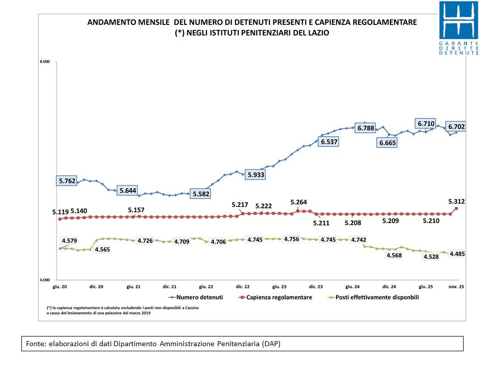 Secondo i dati pubblicati dal Dipartimento dell’amministrazione penitenziaria (Dap) venerdì 5 dicembre e riferiti alla situazione di fine novembre, i detenuti presenti in tutta Italia erano 63.868 mentre nel Lazio 6.702.