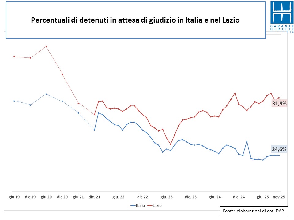 In regione, invece, i numeri di fine novembre sono sostanzialmente simili a quelli registrati a inizio anno ma bisogna però considerare che nel mese di ottobre si è reso necessario trasferire fuori regione un numero consistente di detenuti sfollati dal carcere di Regina Coeli a causa del crollo di una parte del tetto della seconda rotonda.