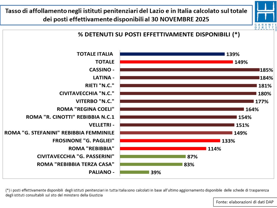 Considerando quindi una capienza effettiva pari a 46 mila posti in Italia e 4.485 nel Lazio, i tassi effettivi di affollamento hanno raggiunto il 139% nell’intero Paese e il 149% in regione.