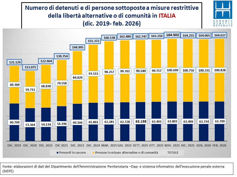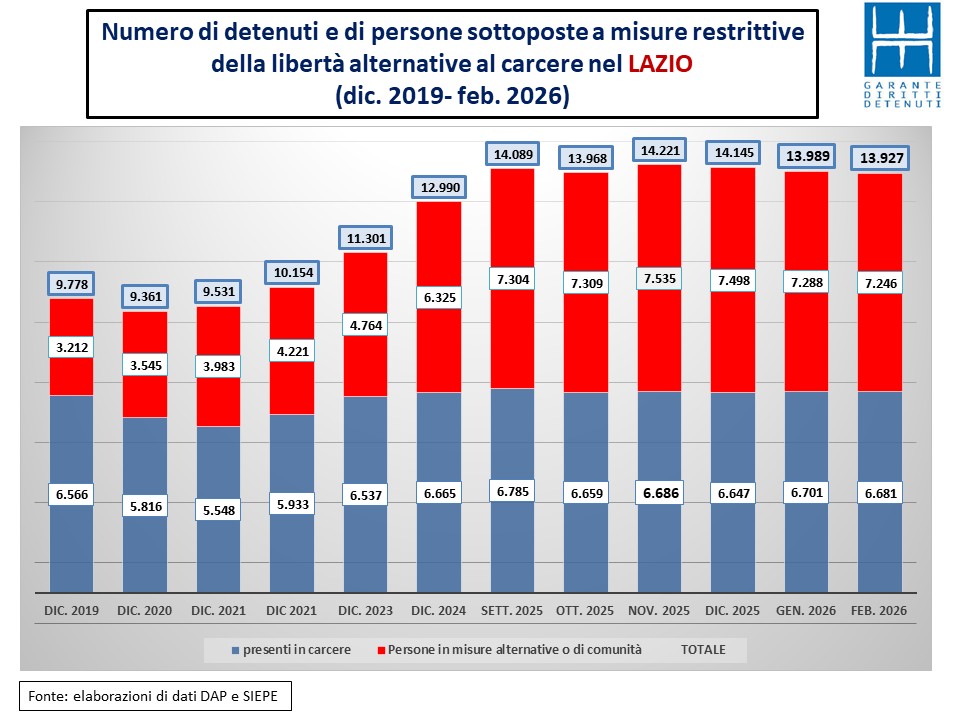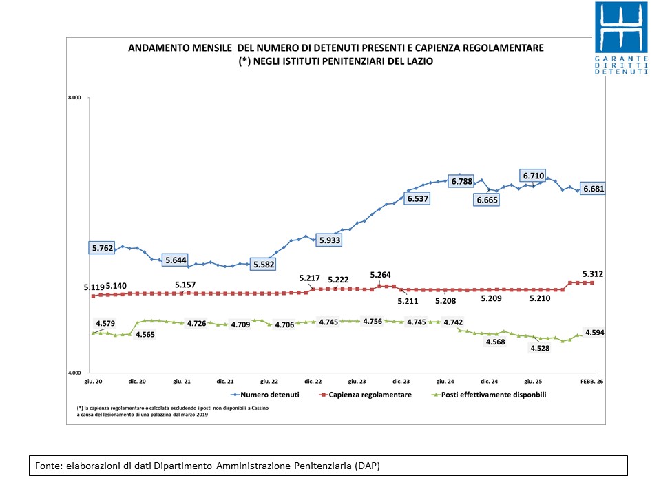 Nel corso del mese di febbraio in tutta Italia il numero di detenuti presenti è cresciuto di sessanta unità corrispondenti allo 0,1% mentre nel Lazio i detenuti presenti risultano venti in meno rispetto alla fine di gennaio (corrispondente a un -0,3%).