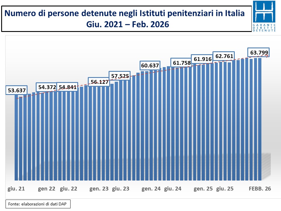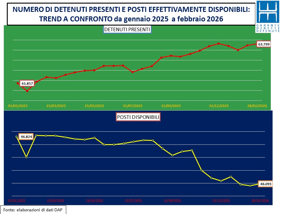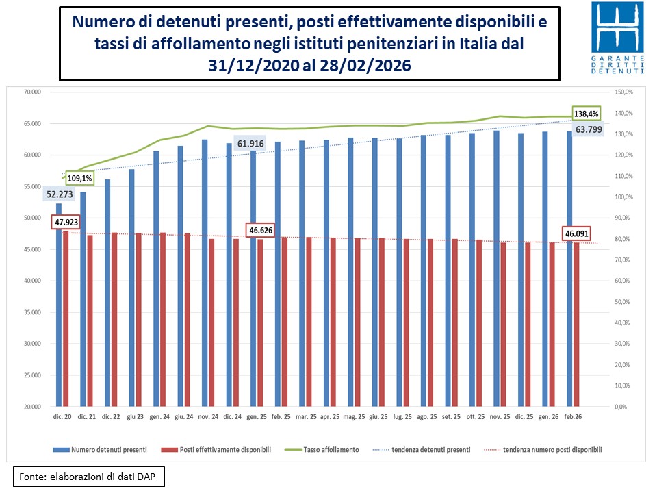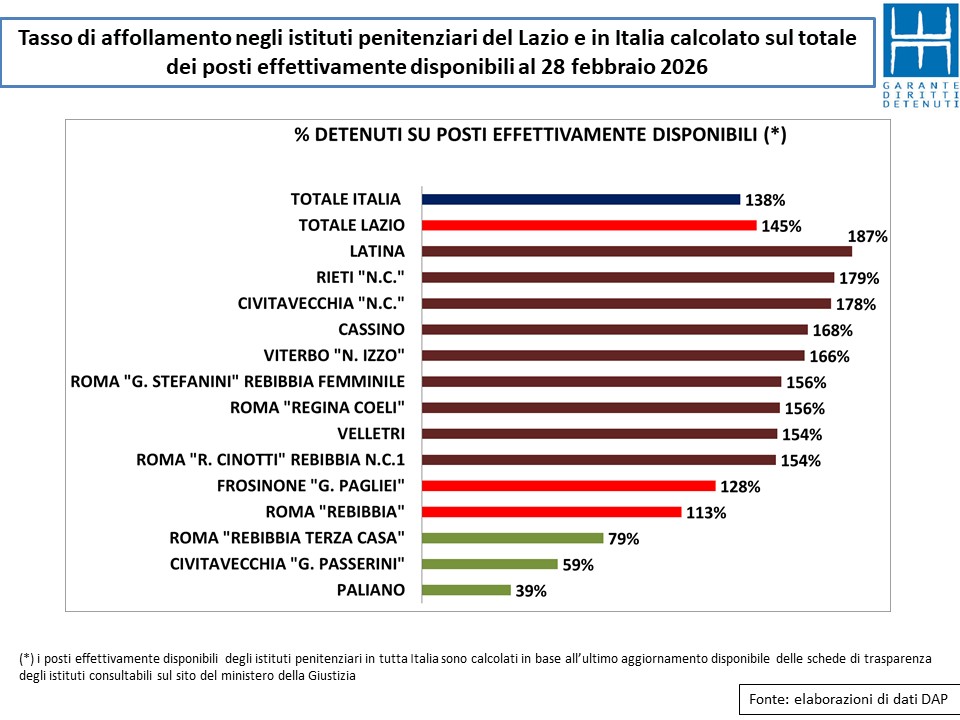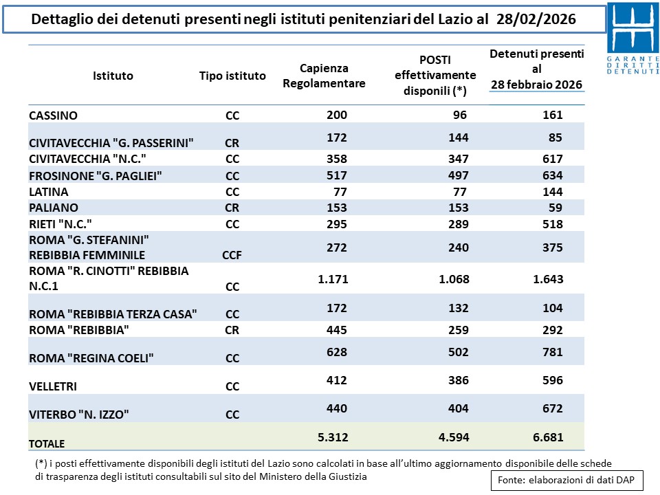 Secondo i dati pubblicati sul sito del ministero della Giustizia i detenuti presenti in Italia a fine febbraio sono 63.799 e nel Lazio 6.681. Quanto ai posti effettivamente disponibili va registrato un incremento di circa 60 unità nel Lazio e di 30 in tutta Italia.