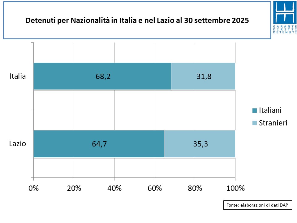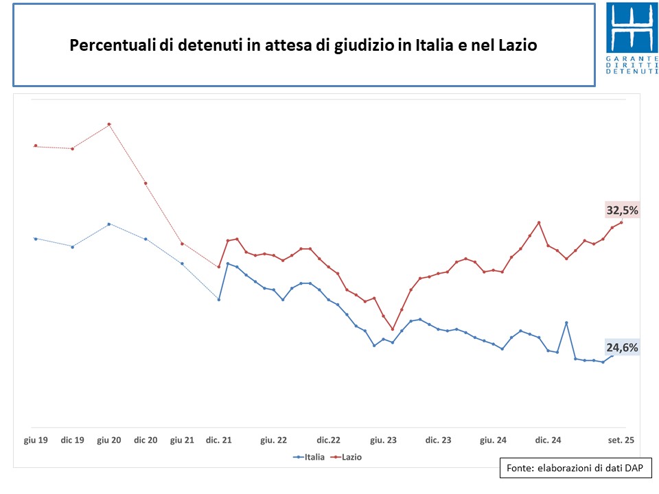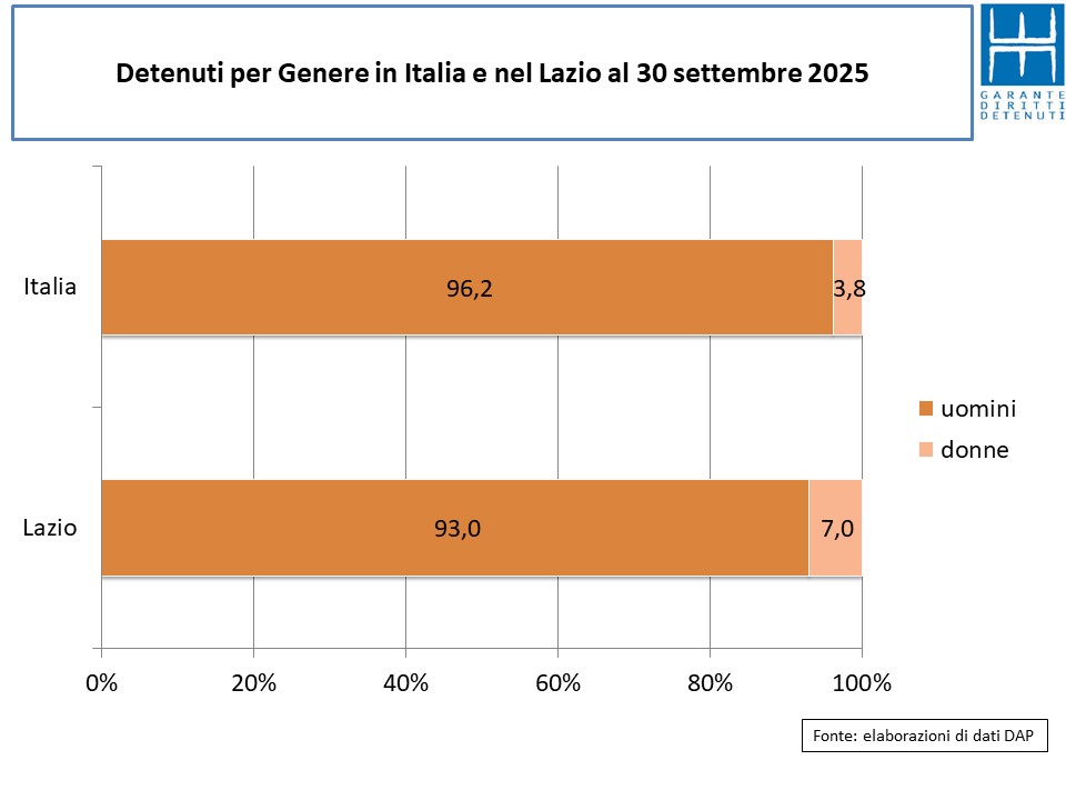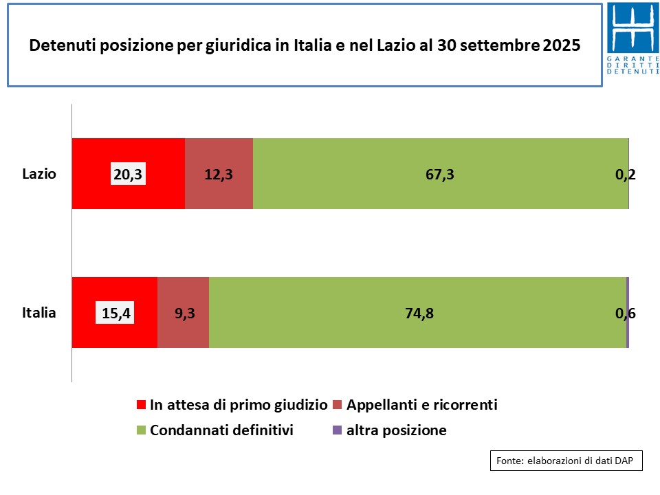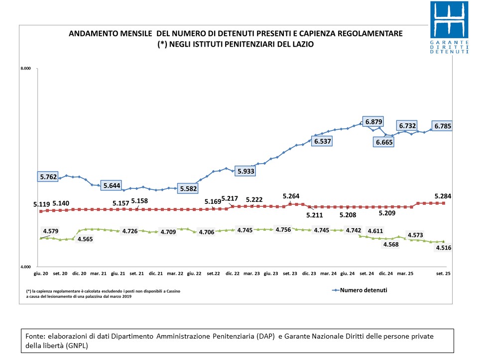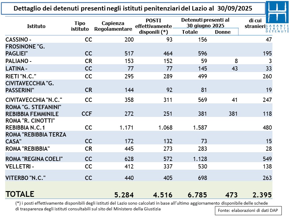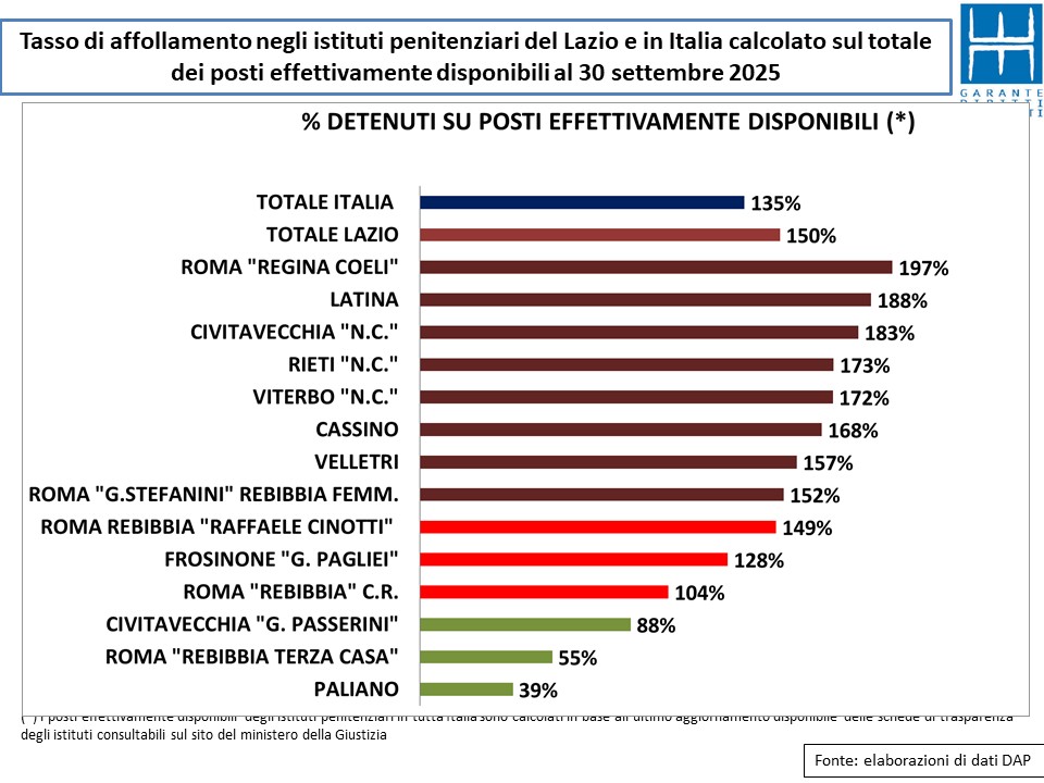 Nel Lazio i numeri del sovraffollamento risultano ancora più critici con e un tasso complessivo del 150,2%.