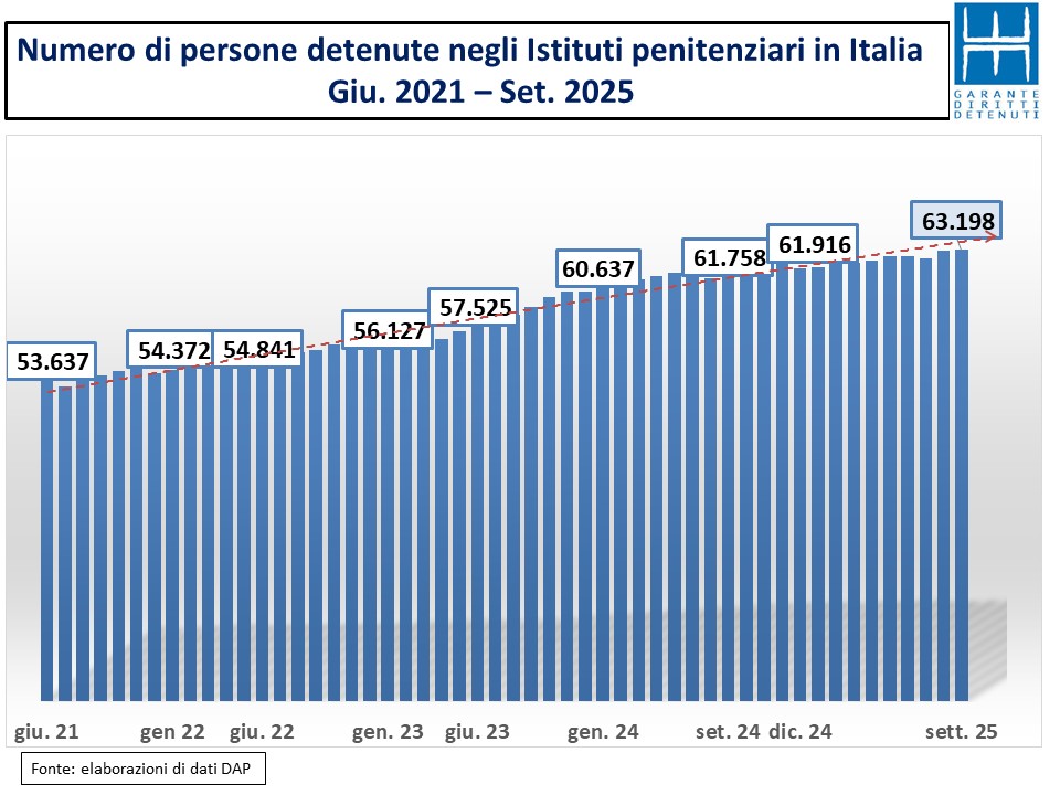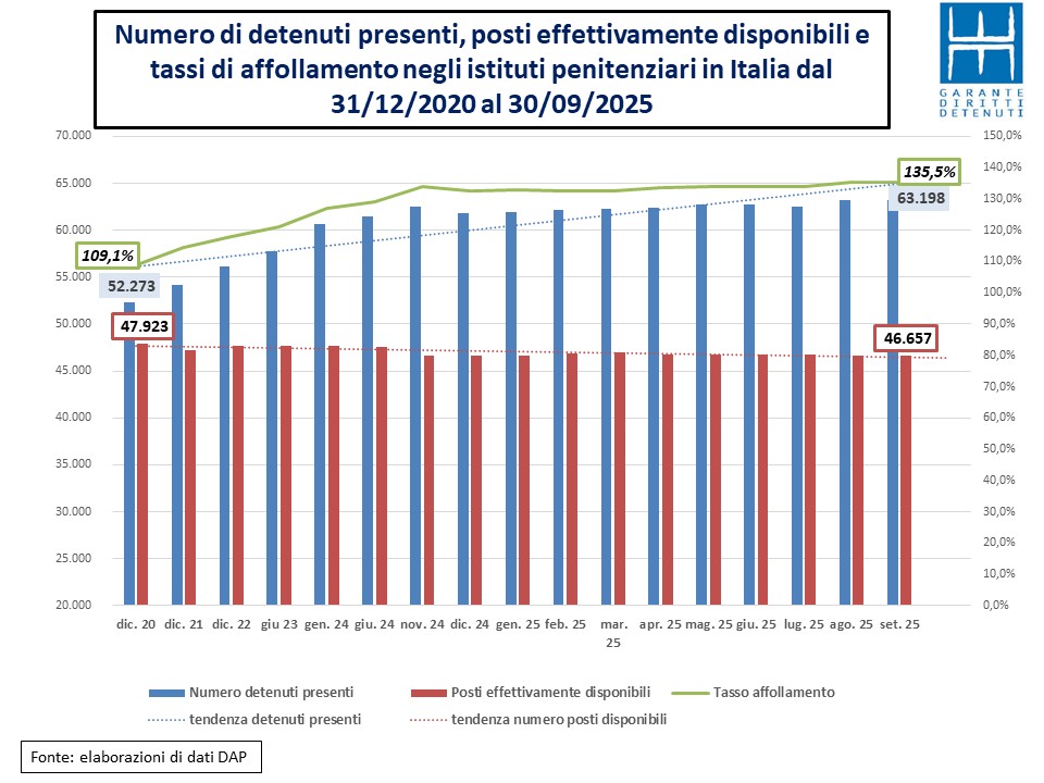 Entrando poi più dettagliatamente nei numeri della detenzione, secondo i dati del Dipartimento dell’amministrazione penitenziaria i detenuti in Italia alla data del 30 settembre risultano essere 63.198 per un tasso di affollamento effettivo del 135%: sono quasi 1.337 in più rispetto all’inizio dell’anno (+2,2%).