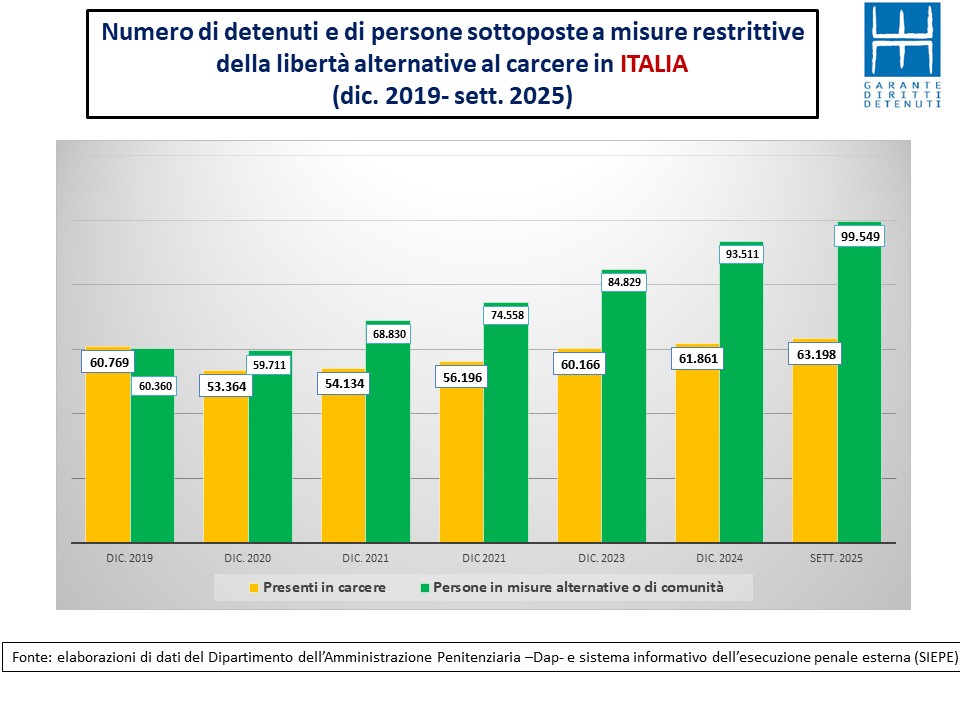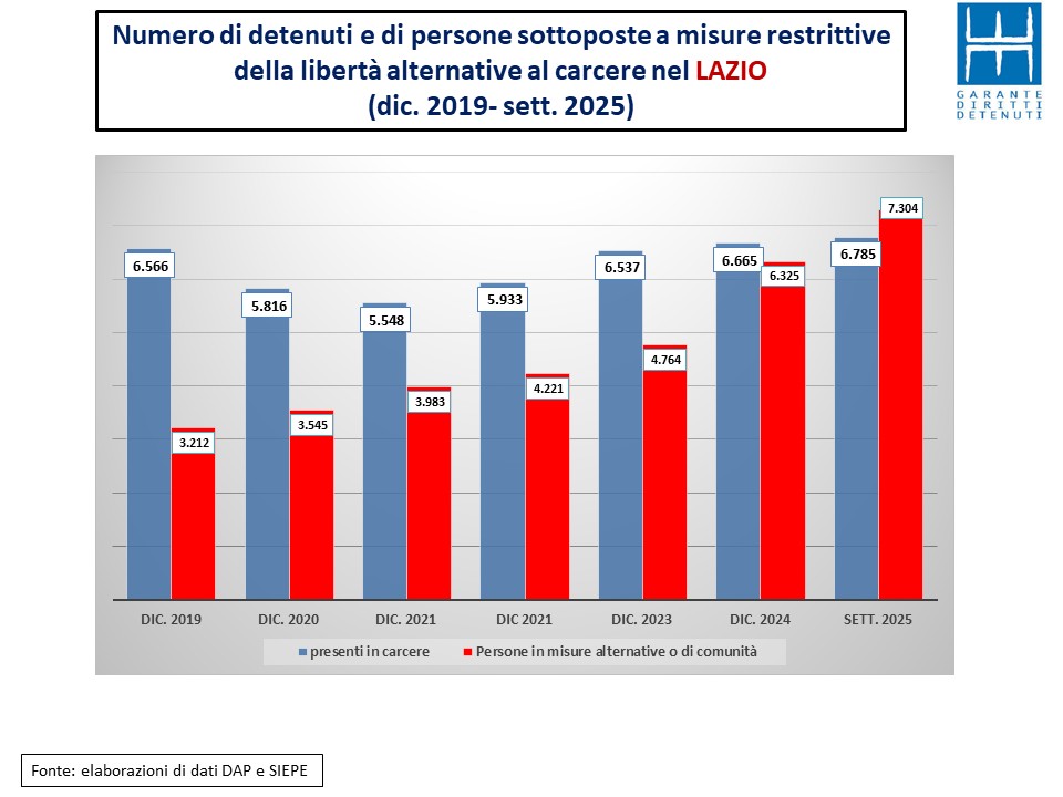 “Finalmente anche nel Lazio le misure penali di comunità hanno superato il numero delle persone detenute, ma anche nel Lazio – come nel resto d’Italia – l’aumento delle alternative alla detenzione non riduce, né contiene le presenze in carcere e il sovraffollamento. Servirebbe una radicale opera di depenalizzazione dei reati minori. Nel frattempo non possiamo aspettare nuovi padiglioni che nella migliore delle ipotesi saranno disponibili tra due anni: è urgente un provvedimento deflativo che riduca le presenze in carcere alla sua capienza regolamentare effettivamente disponibile”. Così il Garante delle persone sottoposte amisure restrittive della libertà personale, Stefano Anastasìa, commenta i dati recentemente diffusi dal Dipartimento dell’amministrazione penitenziaria (Dap) e dal Sistema informativo dell’esecuzione penale esterna (Siepe), secondo i quali nei primi nove mesi del 2025 le persone complessivamente sottoposte a misure penali restrittive della libertà sono oltre 7.300 in più rispetto all’inizio dell’anno.