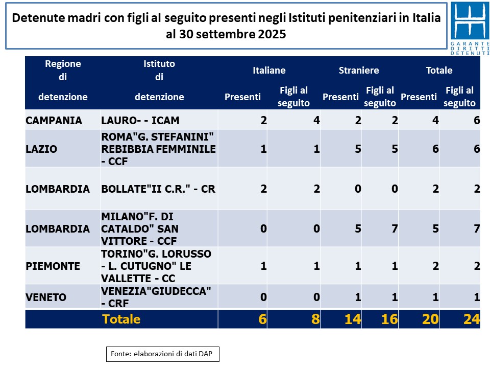 Cresce anche il numero dei bambini reclusi con le loro madri che sono attualmente 24 distribuiti in cinque regioni mentre a inizio anno erano 21.