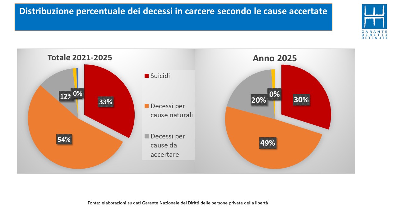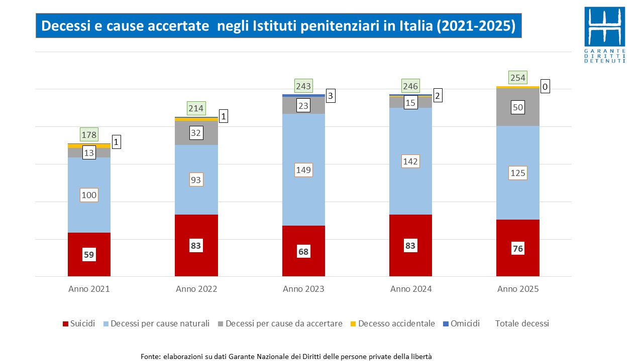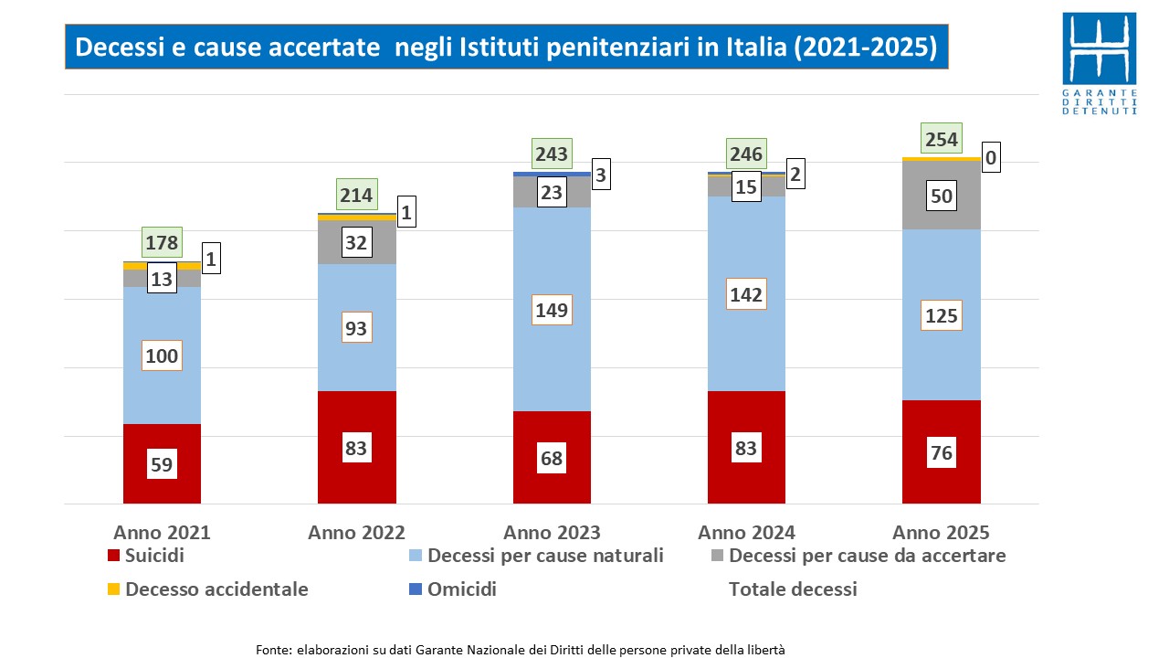 Secondo il dossier diffuso mercoledì 4 marzo dal Garante nazionale dei diritti delle persone private della libertà personale (Gnpl), relativo agli eventi che si sono verificati nel corso del periodo 2021-2025, i decessi complessivamente registrati lo scorso anno negli istituti penitenziari sono stati 254 di cui 76 suicidi accertati. Bisogna anche considerare che vi sono altri 50 casi di morte per cause da accertare e tra questi vi potrebbero essere anche persone che si sono tolte la vita volontariamente. Nel 2024 i decessi sono stati 243 e i suicidi accertati 83.