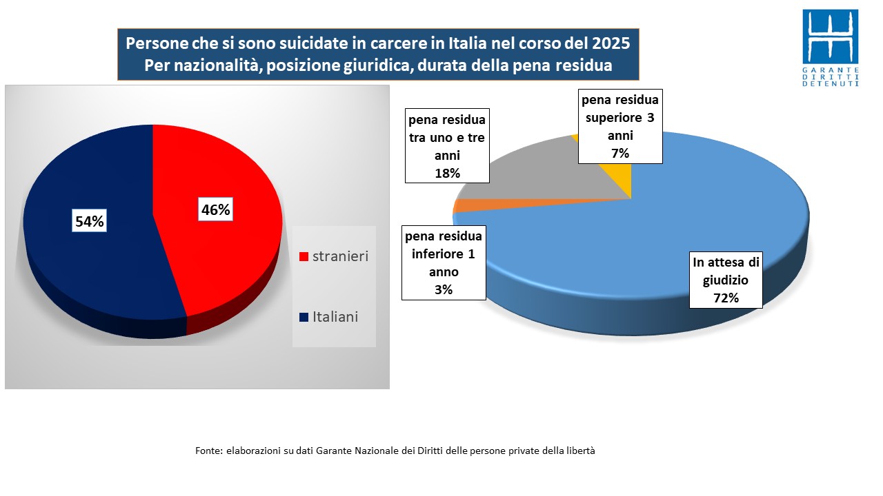 Va sottolineato in maniera particolare che, delle 76 persone che si sono tolte la vita nel 2025, gli stranieri erano 35. Si tratta di una percentuale del 46% sul totale che risulta decisamente superiore all’incidenza di detenuti stranieri sull’intera popolazione carceraria che era stata del 31,7% nel corso del 2025.