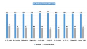 • tutto il personale detenuto è impiegato quotidianamente in attività lavorativa di cui, come sopra indicato, n.18 in servizi d’istituto e n. tre in mof e n. sette detenuti nelle attività legate a lavorazione ferro, ceramica, pizzeria, pasta all’uovo, falegnameria.
