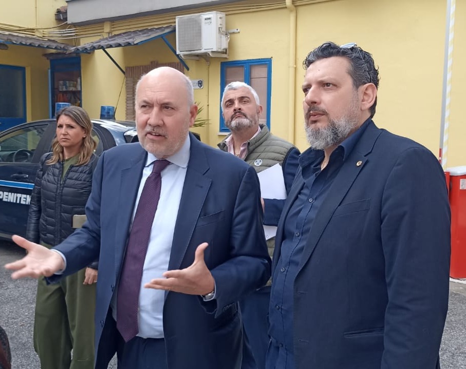 Anastasìa e Novelli, in primo piano, iniziano la visita di monitoraggio alla Casa circondariale di Paliano.
