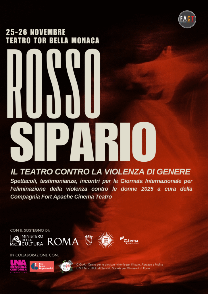 In occasione della Giornata Internazionale per l’Eliminazione della Violenza sulle Donne 2025, martedì 25 e mercoledì 26 novembre si terrà al Teatro Tor Bella Monaca di Roma l’evento Rosso Sipario: il teatro contro la violenza di genere, progetto realizzato con il sostegno del Ministero della Cultura – Direzione Generale Spettacolo e vincitore dell’Avviso Pubblico Roma Creativa 365. Cultura tutto l’anno promosso da Roma Capitale – Assessorato alla Cultura in collaborazione con Zètema Progetto Cultura.