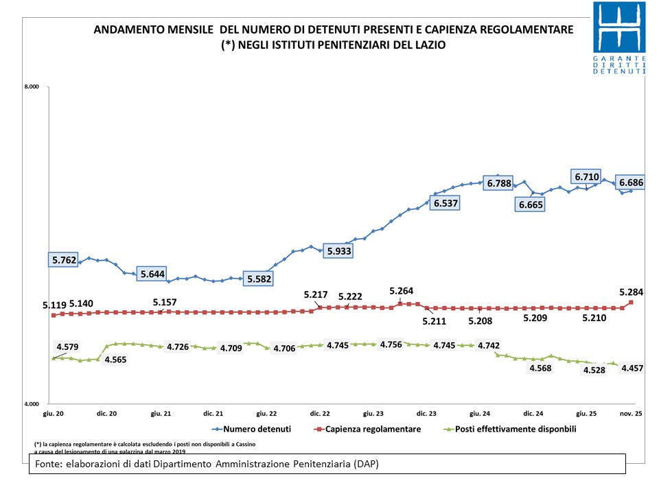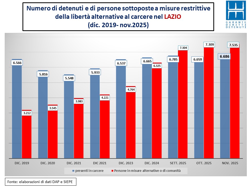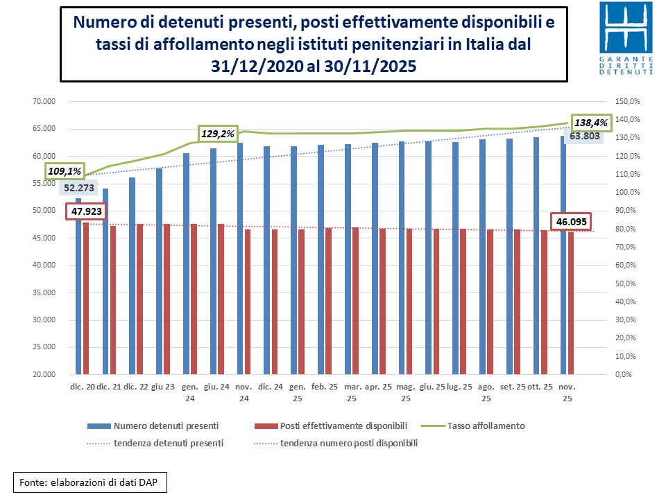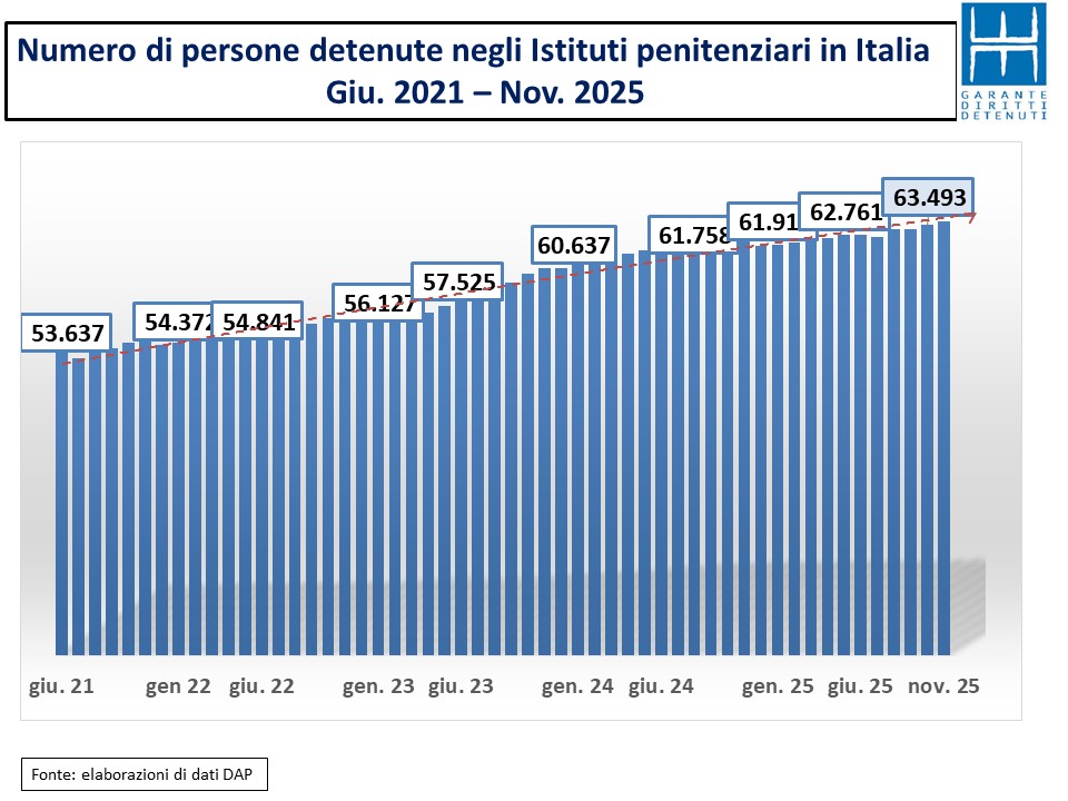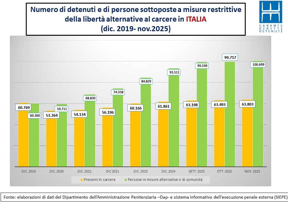 In termini assoluti negli undici mesi di questo 2025 le persone sottoposte a misure restrittive della libertà sia in carcere che al di fuori di esso sono aumentate di oltre 9.000 unità. In termini percentuali il tasso registrato è stato del 5,6%.